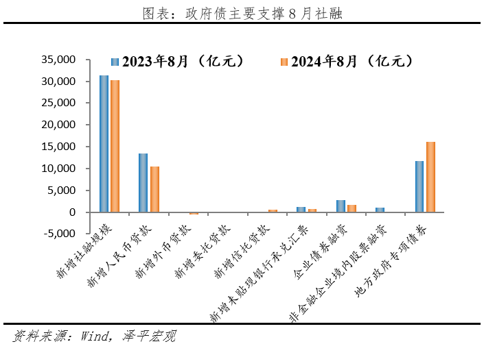 1) 社融增速放缓,主要靠政府债支撑。8月存量社融同比增长8.1%,较上月下降0.1个百分点。新增社会融资规模30298亿元,同比少增981亿元,结构上主要靠政府债支撑。