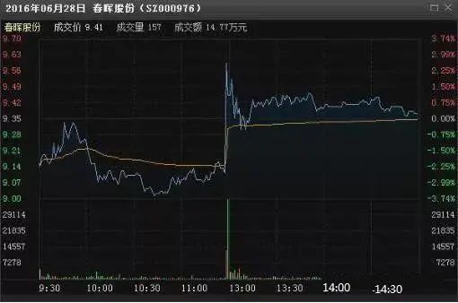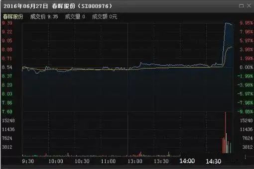 6月27日春晖股份的尾盘更明显,也是在毫无征兆的情况下,14:49突然有资金把它从涨1%不到拉至接近涨停报收,结果6月28日集合竞价出来就跌2%,盘中最大跌幅接近4%: